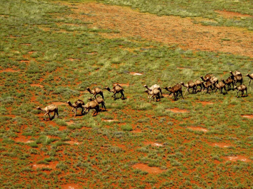 ラクダは別名「The Ship of the Desert(砂漠の船)」とも呼ばれるように、乾燥した環境に適応した動物です。背中のこぶに脂肪を蓄えることで長期間の飢えや渇きに耐えることができ、降水量が少なく植生の乏しい地域でも生存できます。実際、19世紀にオーストラリアへ持ち込まれたラクダは、内陸部の乾燥地帯の気候や地形に適応し、放逐された個体を中心に野生化しました。現在では100万頭を超えるとされる、世界最大規模の野生ラクダ個体群が形成されています。