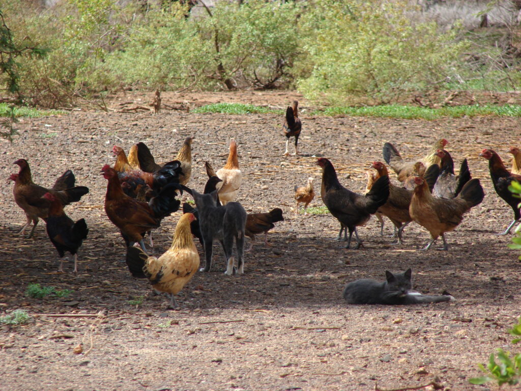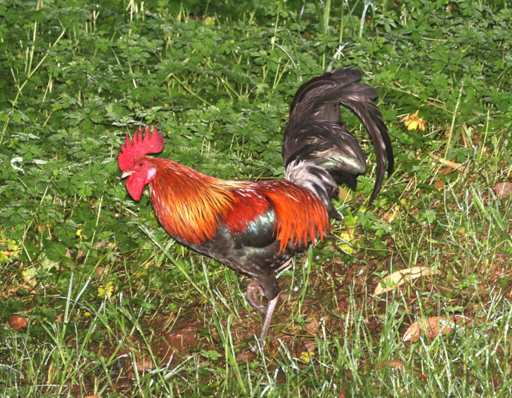 そして20世紀後半には、1982年のイワと、1992年のイニキという二度のハリケーンにより、特にカウアイ島で多くの鶏舎が破壊され、その結果、大量のニワトリが自然界へ逃げ出しました。本来であれば野生に放たれた家畜は捕食者によって数が制限されますが、ハワイにはヘビや大型哺乳類といった主要な捕食者がほとんどいません。さらに、年間を通して温暖な気候と豊富な餌資源が揃っているため、順調に繁殖し、野生化しました。この過程で、逃げ出したニワトリは現地のポリネシアヤケイと交雑し、現在のハワイの野生ニワトリは両者の遺伝的特徴を併せ持つ独特な集団となっています。