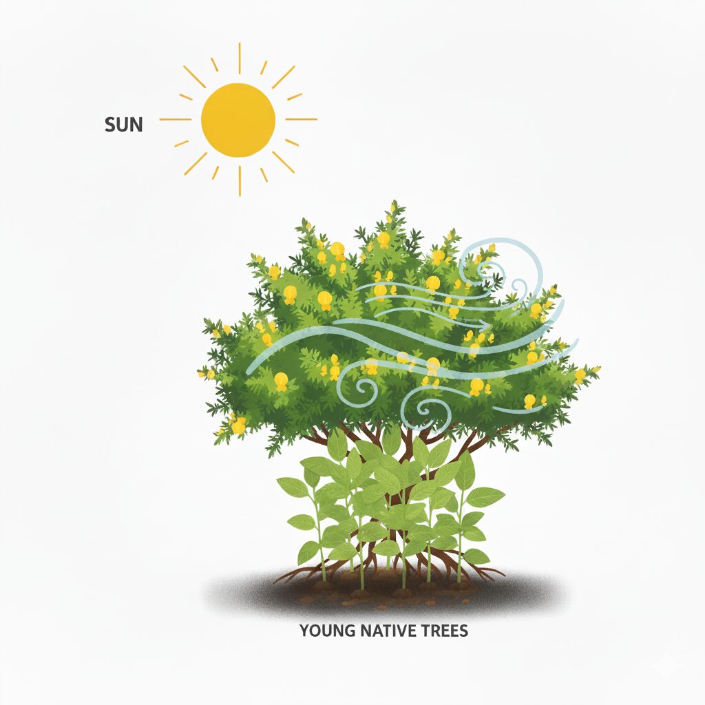 在来樹木の種子が発芽して若い木になる初期段階では、直射日光が強すぎると乾燥してしまったり、高温で枯れてしまうことがありますが、ハリエニシダの日陰が適度な光と湿度を保つことで、デリケートな若い木が無事に成長できる環境を作り出すのです。